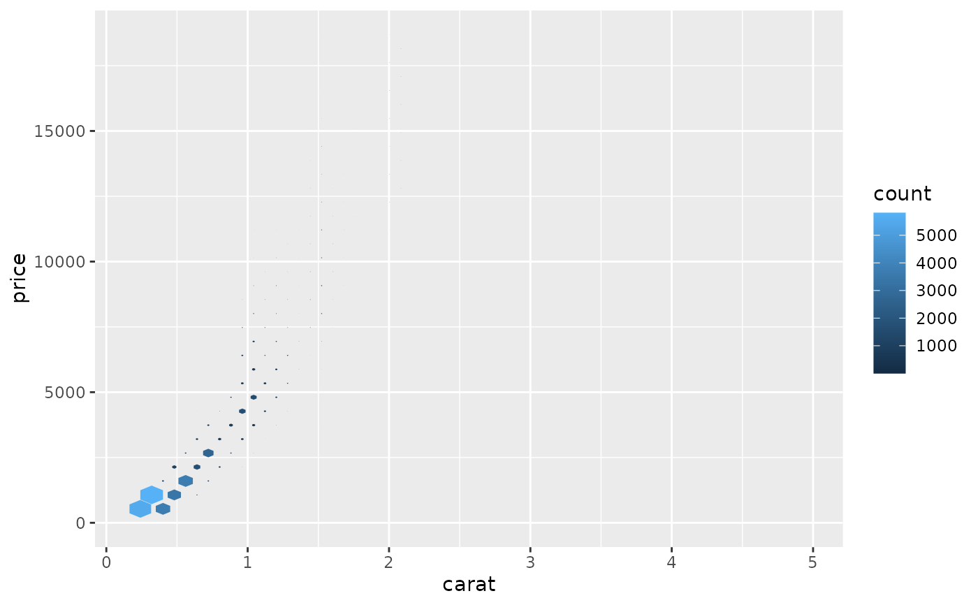 geom_hex()andstat_bin_hex(). For more information about overriding these connections, see how the stat and geom arguments work.- binwidth